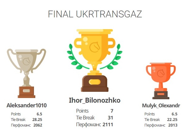 У підсумку долю кубків та медалей вирішували не тільки очки, але й додаткові коефіцієнти. Отже 3-є місце посів Мулик Олександр, провідний юрисконсульт департаменту судової роботи, на 2-му місці Третяк Олександр, оператор з дослідження свердловин 4 розряду геологічної служби Пролетарського ПСГ, а перемогу здобув Білоножко Ігор, провідний інженер філії Науково-дослідного інституту транспорту газу.